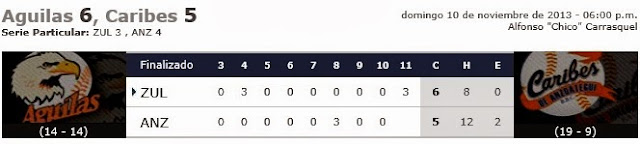 Las Águilas del Zulia vencieron 6-5 a los Caribes de Anzoátegui, en 11 innings. Los rapaces cortaron una racha de cinco victorias que tenía la tenían los dirigidos por Alfredo Pedrique.