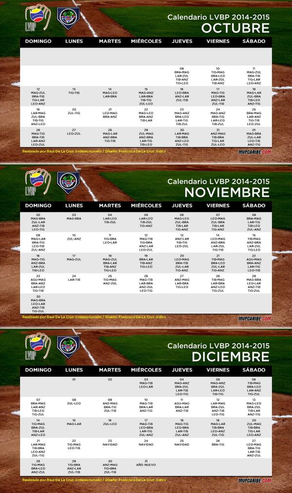 El productor nacional independiente Francisco De la Cruz ( y su hermano Raúl de la Cruz de mvpcaribe.com) compartió en su cuenta Twitter @dlcv y en formato pdf el calendario de completo de la LVBP temporada 2014-2015.